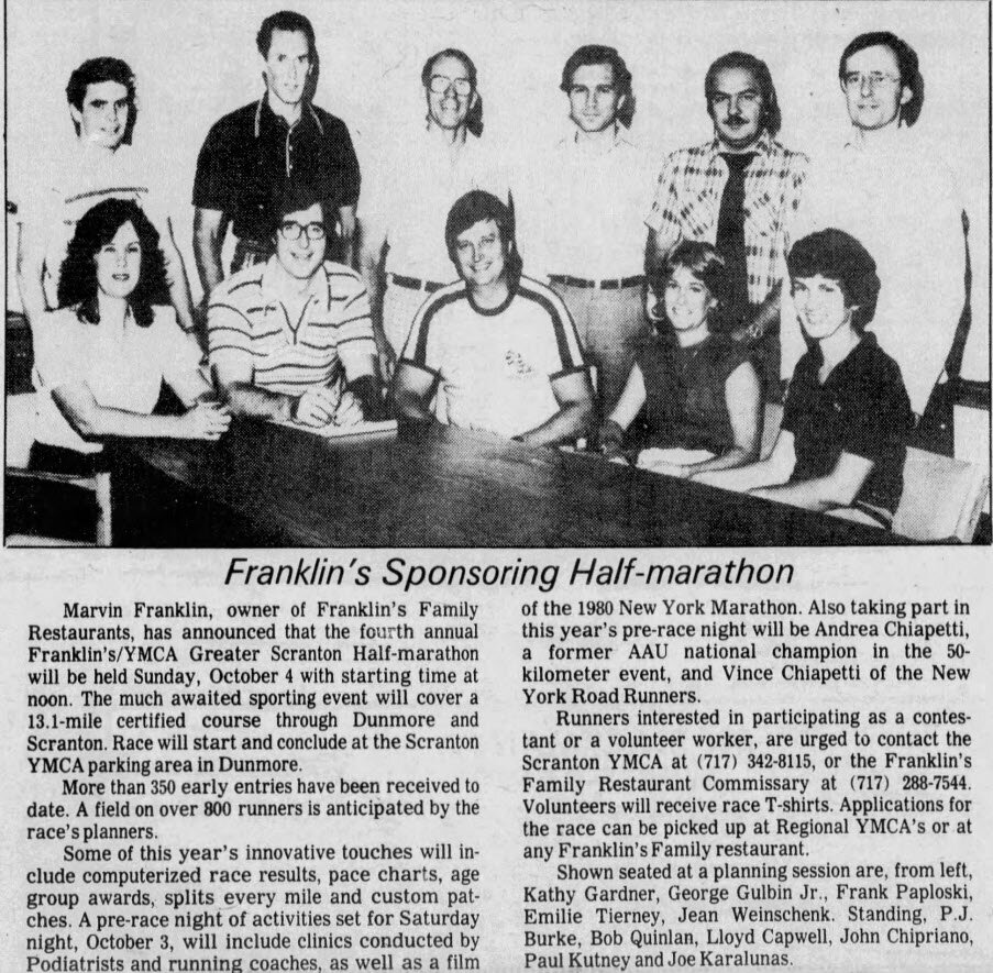In 1977, the Franklin’s / YMCA Greater Scranton half-marathon began with Frank Poplaski as Franklin’s primary representative. While Franklin’s 13.1-mile marathon may have imitated the “Elby’s Distance Race” 12.4-mile marathon that the Bourys started the same year in Wheeling, it was Franklin’s way of giving back to the YMCA that leased land for the Dunmore unit that stood adjacent to the Greater Scranton YMCA.